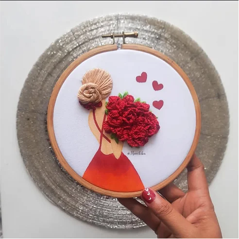 Hand-embroidered 8- inch hoop with an abstract back view of a woman holding a red floral bouquet, accented by floating hearts.