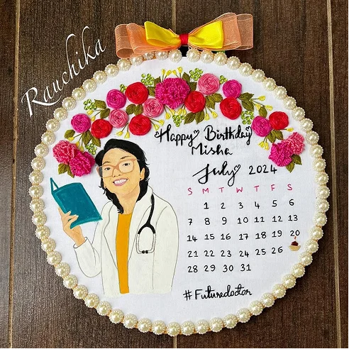10-inch Personalized hand-embroidered hoop with a hand-painted doctor portrait and customized birthday calendar. Features floral embroidery and pearl accents.