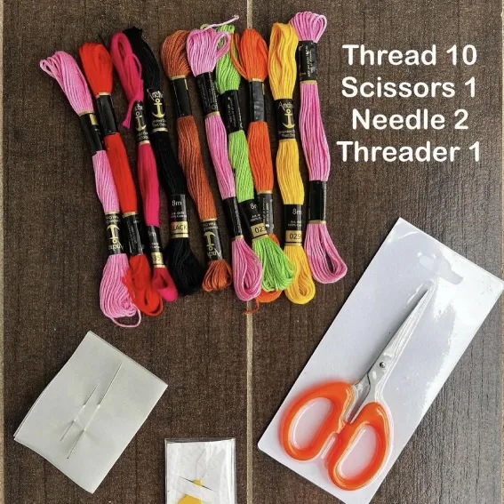 8-inch hoop with pre-designed cotton fabric, 10 premium threads, scissors, 2 needles, threader, backing thread, stitch card, and video tutorial.