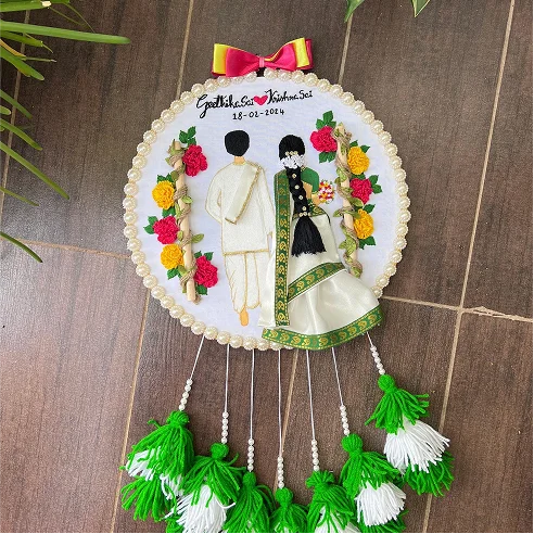 This vibrant 10-inch hand-embroidered hoop of a traditional Indian wedding couple, framed by striking red and yellow flowers. Personalized names( with Tassels) /date.
